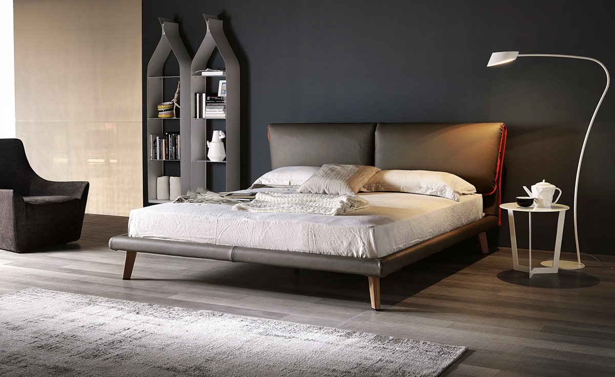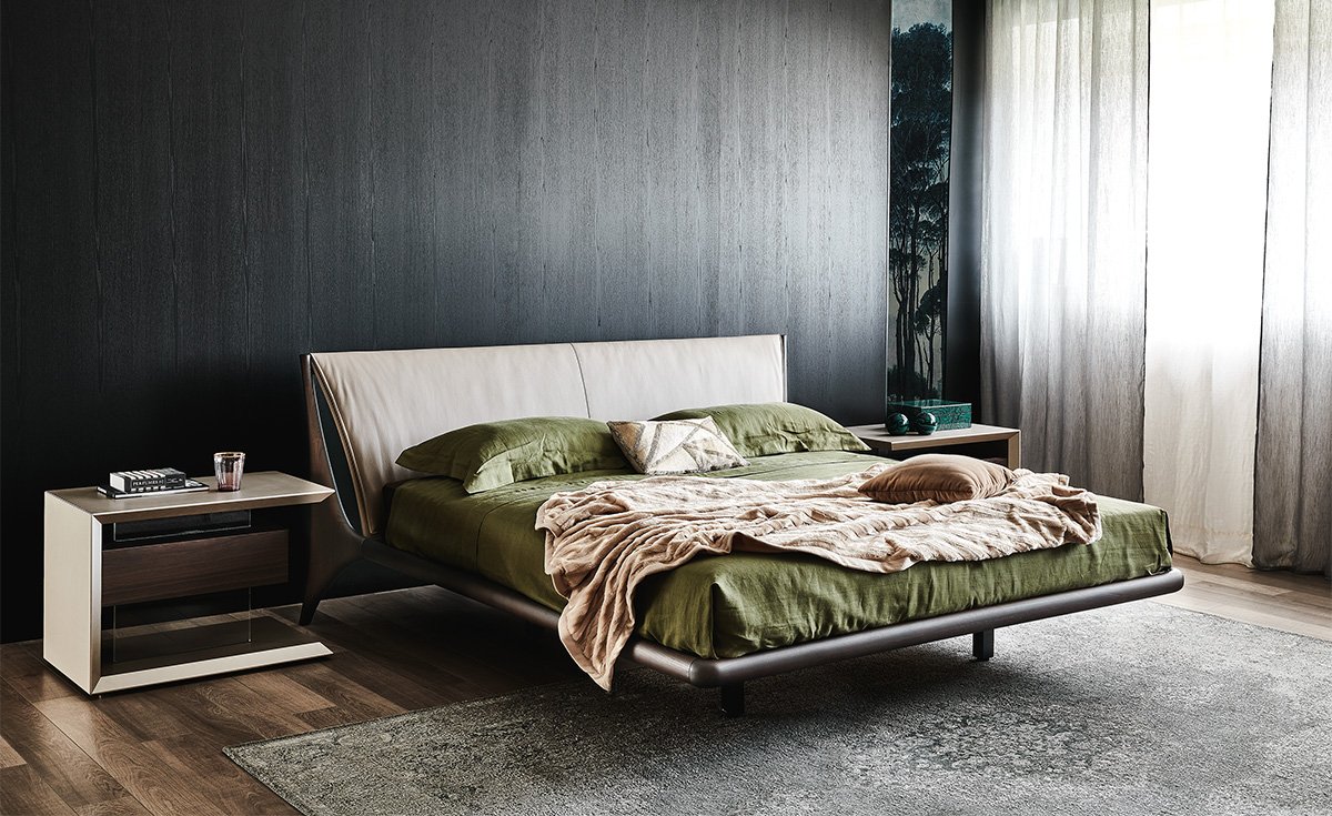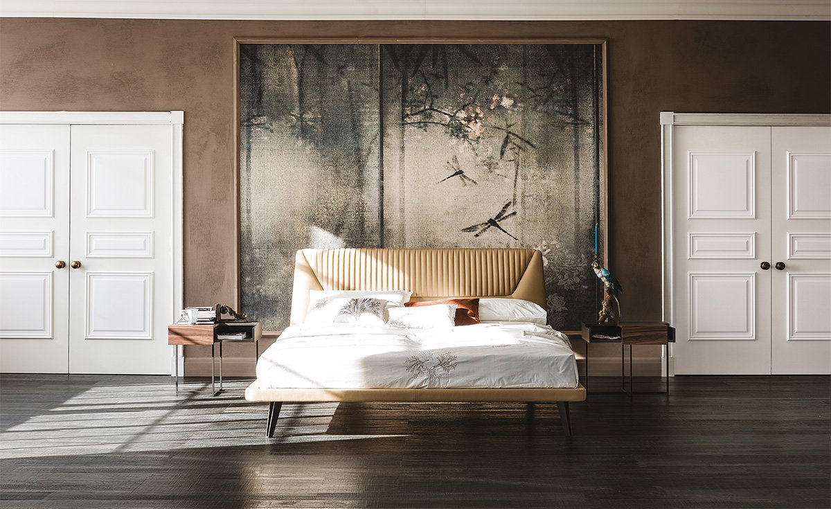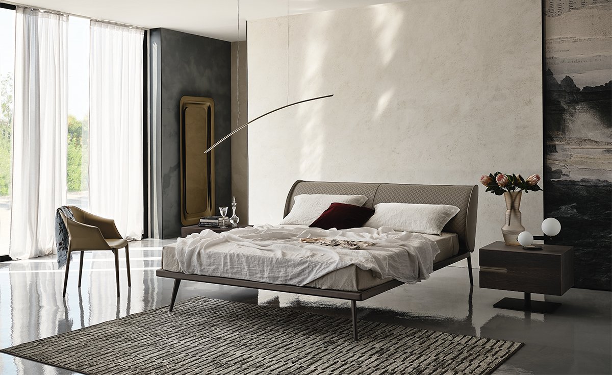 Raffinierte Polsterbetten in eleganten Materialien und Farbtönen verleihen dem Schlafzimmer Ruhe und Geborgenheit.